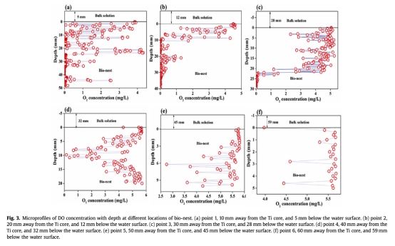 2 數據:DO濃度隨生物巢深度的微剖面,來自Fig.3。研究意義:微電極測量顯示DO能滲透到50mm深度,且濃度波動表明氧傳輸在厘米尺度不受限,這揭示了生物巢內部的好氧環境支持微生物活動,挑戰了傳統生物膜厚度限制的認知。