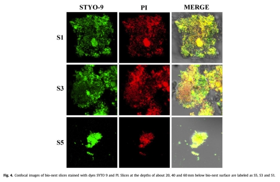 3 數據:細菌活性通過Live/Dead染色的共聚焦圖像,來自Fig.4。研究意義:圖像顯示即使在60mm深度也有活細菌分布,表明生物巢在深層仍保持生物活性,這證實了BF載體能支持厚生物膜的可持續性,對廢水處理中的生物量保留和效率提升至關重要。
