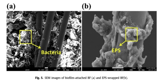 4 數據:生物膜吸附特性和EPS功能團分析,來自Fig.5和Fig.6。研究意義:SEM圖像顯示BF被生物膜緊密包裹,FTIR光譜揭示EPS中的多糖和蛋白質功能團(如C=O、C-N)在吸附和交叉鏈接BF中起主導作用,這解釋了生物巢結構穩定性的機制,為載體設計提供了分子水平見解。