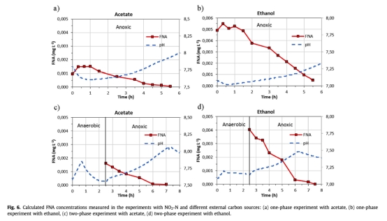 2 數據:FNA(游離亞硝酸)濃度計算值,來自Fig.6。研究意義:FNA濃度與N2O積累相關,但實驗表明亞硝酸鹽濃度本身是更直接的抑制因子,這支持了模型中使用的亞硝酸鹽抑制函數,并解釋了在不同pH條件下N2O產生的變化。