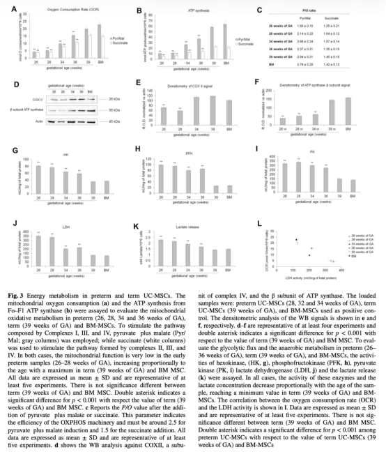 1 早產(chǎn)MSC主要依賴無(wú)氧糖酵解,足月MSC切換到氧化磷酸化,代謝切換 around 34周孕齡發(fā)生。