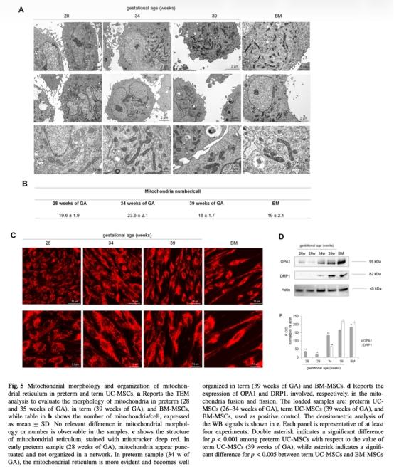研究思路包括收集早產(chǎn)和足月新生兒臍帶樣本,分離MSC并進(jìn)行細(xì)胞培養(yǎng)。使用流式細(xì)胞術(shù)鑒定MSC標(biāo)志物。測(cè)量能量代謝參數(shù),如ATP/AMP比率、氧消耗(使用丹麥Unisense電極)、ATP合成、糖酵解酶活性和氧化應(yīng)激指標(biāo)。進(jìn)行蛋白質(zhì)印跡分析線粒體相關(guān)蛋白表達(dá),如COXII、ATP synthase β subunit、OPA1、DRP1和CLUH。通過(guò)CLUH沉默實(shí)驗(yàn)驗(yàn)證其功能。使用透射電鏡和共聚焦顯微鏡觀察線粒體形態(tài)。數(shù)據(jù)通過(guò)統(tǒng)計(jì)分析和相關(guān)性檢驗(yàn)處理。