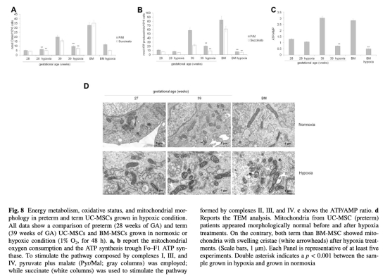 8 缺氧效應(yīng)數(shù)據(jù):缺氧條件下代謝變化,來(lái)自圖8。研究意義是早產(chǎn)MSC對(duì)缺氧更耐受,足月MSC氧依賴性強(qiáng)。