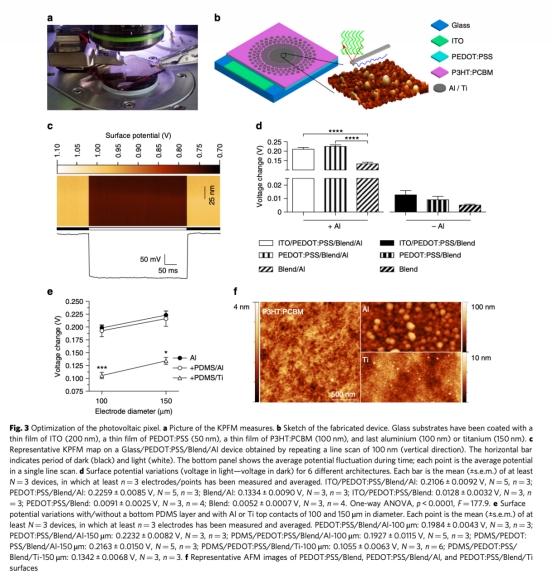 1 表面電位變化數據:來自圖3,通過KPFM測量,顯示光照下鋁陰極的表面電位變化約0.21V,而鈦陰極略低。研究意義是優化光伏像素的材料組合,確保高效電荷生成,為假體刺激效率提供基礎。