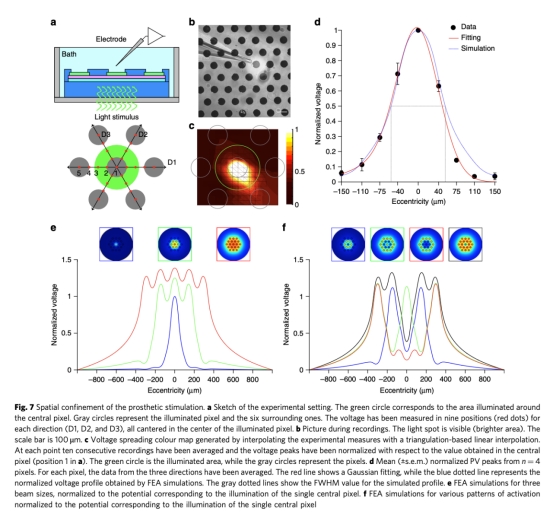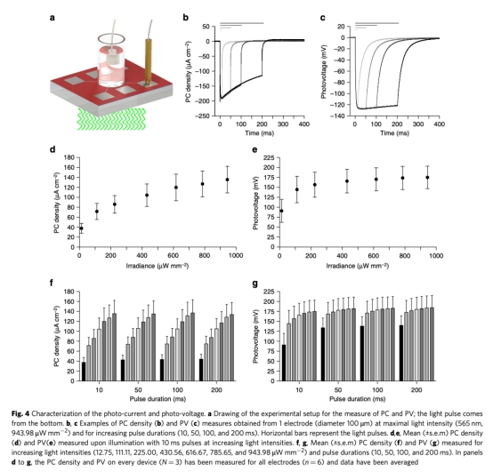 使用丹麥Unisense電極(如pH微電極)測量pH變化數據(來自Supplementary Fig. 2),研究意義在于驗證假體在操作過程中不會引起有害的化學變化。具體地,在1小時脈沖光照下,pH變化僅0.002單位,表明鈦電極界面穩定,沒有產生有害的電解反應,從而確保假體的生物相容性和安全性。這種測量提供了關鍵證據,證明假體在生理環境中不會破壞酸堿平衡,減少了潛在的組織損傷風險,支持其臨床應用的可行性。