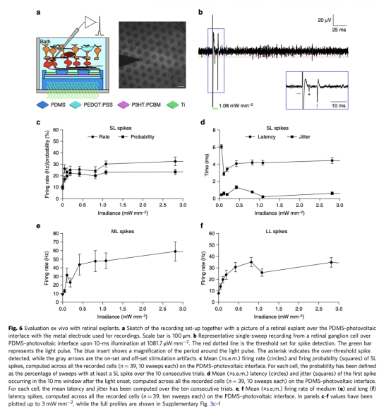 4 離體視網膜刺激數據:來自圖6,顯示在離體小鼠視網膜中,短潛伏期(SL) spikes在 irradiance 高于1.08 mW/mm2時飽和,平均潛伏期4.12ms。研究意義是證實假體能有效激活視網膜神經節細胞,且響應可控。