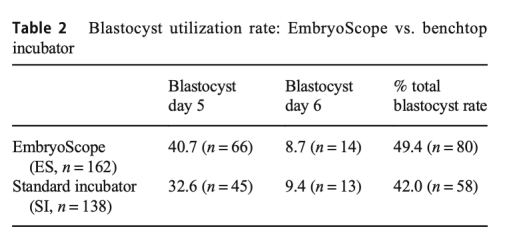 3 第5/6天優質囊胚比例數據:來自表2,ES組為49.4%,SI組為42.0%,P=0.24(不顯著)。研究意義是顯示兩者在長期囊胚發育中類似,ES雖略優但未達顯著性,表明培養箱在后期發育中效應減弱。