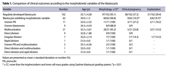 2. 形態(tài)動(dòng)力學(xué)變量類型:如不均等原核、不均等卵裂球、多核化等,具體變量組的植入率和妊娠率較低,例如多核化組植入率14.3%,數(shù)據(jù)來自Table 1。研究意義是不同變量對胚胎發(fā)育有不同程度負(fù)面影響,有助于識別高風(fēng)險(xiǎn)胚胎。