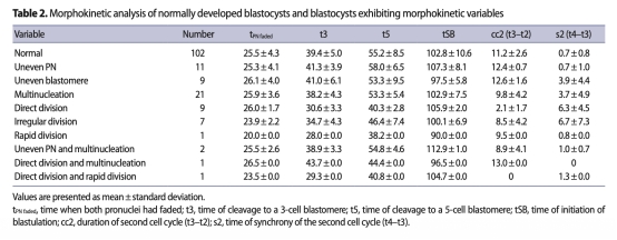 3. 胚胎發(fā)育時(shí)間數(shù)據(jù):如tPN faded、t3、t5等時(shí)間點(diǎn),有形態(tài)動(dòng)力學(xué)變量的囊胚發(fā)育時(shí)間變異大,例如直接分裂組t3時(shí)間較短(30.6小時(shí) vs. 正常組39.4小時(shí)),數(shù)據(jù)來自Table 2。研究意義是發(fā)育時(shí)間異常可能反映胚胎內(nèi)在缺陷,與臨床結(jié)果惡化相關(guān)。