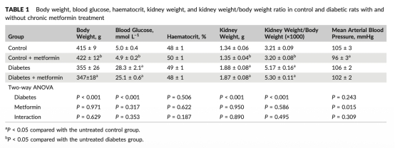 1. 體重、血糖、腎重量等生理參數 [來自表1] - 研究意義是確認糖尿病模型成功建立,顯示糖尿病動物體重減輕、血糖升高、腎肥大,而二甲雙胍不影響這些參數,表明其效應獨立于血糖穩態。