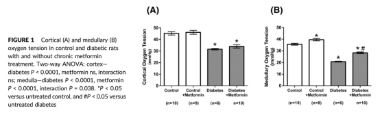 2. 皮質和髓質氧張力 [來自圖1] - 研究意義是直接證明糖尿病導致腎髓質缺氧,二甲雙胍特異性改善髓質氧張力而不影響皮質,突出了其對髓質微環境的保護作用。