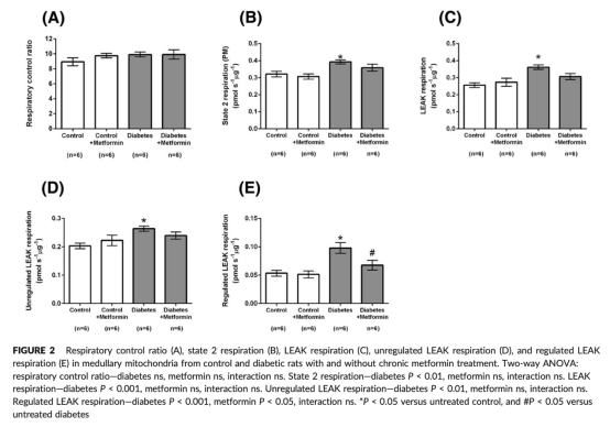 4. 線粒體呼吸參數(如呼吸控制比、LEAK呼吸、UCP2和ANT敏感呼吸) [來自圖2、圖3和表3] - 研究意義是揭示糖尿病增加線粒體質子LEAK,尤其是UCP2介導部分,二甲雙胍選擇性減少UCP2依賴的LEAK,表明其通過改善線粒體效率緩解缺氧。