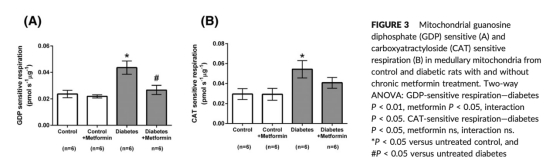 摘要部分闡述了研究目的是檢驗二甲雙胍對胰島素缺乏糖尿病動物模型腎臟氧代謝和線粒體功能的影響,以分離其腎臟保護作用與血糖穩態的影響。方法包括給大鼠注射鏈脲佐菌素(STZ)誘導糖尿病,并給予二甲雙胍治療。在體測量腎功能和腎內氧張力,體外分離線粒體進行呼吸測量和超氧化物評估。結果發現二甲雙胍改善了髓質組織氧張力,而不影響血糖穩態;減少了UCP2依賴的LEAK呼吸,并差異性地影響線粒體超氧化物產生。結論是二甲雙胍減輕糖尿病誘導的腎髓質缺氧,機制獨立于血糖穩態,涉及減少UCP2介導的線粒體質子LEAK。