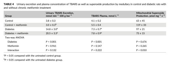 5. 超氧化物生產和氧化應激標記(TBARS) [來自表4] - 研究意義是表明糖尿病增加氧化應激,但二甲雙胍差異性地影響線粒體超氧化物產生,提示其可能通過調節活性氧物種影響UCP2活性。
