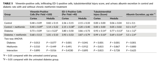 6. 組織學損傷和炎癥細胞浸潤 [來自表5] - 研究意義是評估糖尿病腎病的結構性改變,二甲雙胍未顯著改善損傷評分或 albuminuria,表明短期治療可能主要影響功能而非結構。