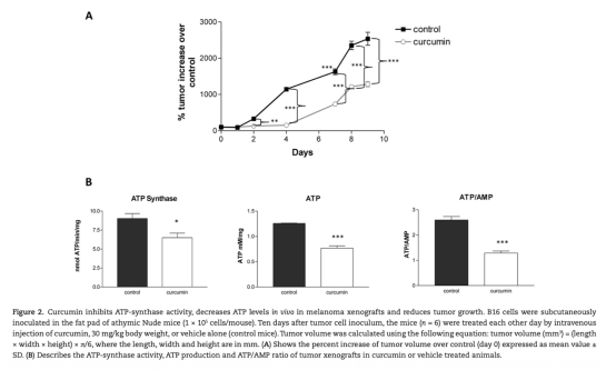 6 來自圖2A和B:體內腫瘤生長延遲,ATP合酶活性和ATP水平下降。研究意義是驗證姜黃素在體內的抗腫瘤效果和能量損傷。
