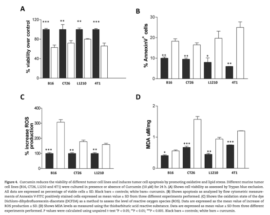9 來自圖4B:凋亡增加,B16、CT26、L1210和4T1細胞分別增加83%、73%、146%和316%。研究意義是姜黃素誘導程序性細胞死亡。