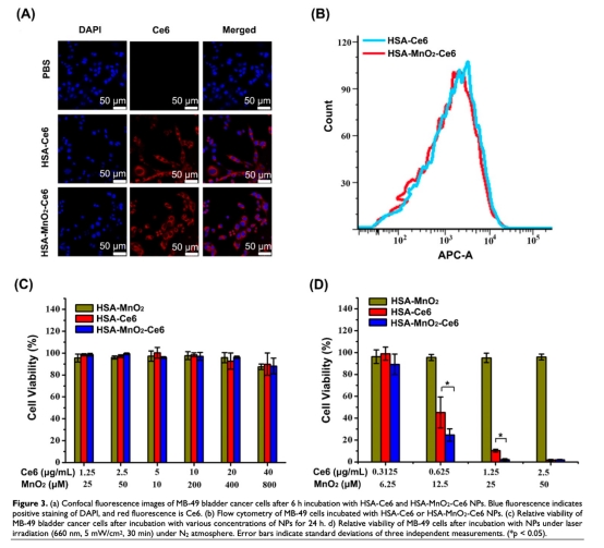 4 來自圖3c和3d:細(xì)胞活力實(shí)驗(yàn)顯示,NPs本身無毒性,但在激光照射下,HSA-MnO2-Ce6 NPs比HSA-Ce6 NPs更能降低膀胱癌細(xì)胞活力。研究意義是證明NPs通過改善缺氧增強(qiáng)了PDT的細(xì)胞殺傷作用,且安全性高。