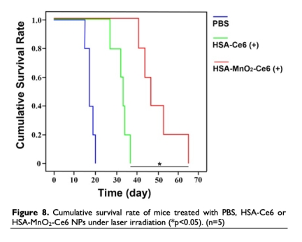 10 來自圖8:生存分析顯示HSA-MnO2-Ce6 NPs加激光照射組小鼠生存期延長(zhǎng)。研究意義是表明NPs治療具有長(zhǎng)期益處,能提高生存率。