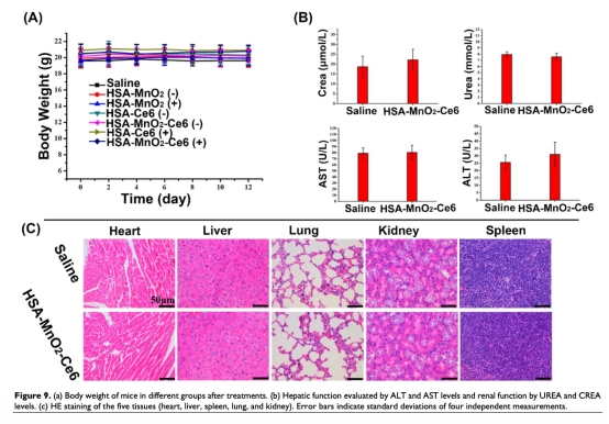 9 來自圖7a和7c:治療實(shí)驗(yàn)顯示,HSA-MnO2-Ce6 NPs加激光照射組腫瘤體積顯著減小,HE染色顯示腫瘤壞死增加。研究意義是證明NPs增強(qiáng)的PDT能有效抑制腫瘤生長(zhǎng)。