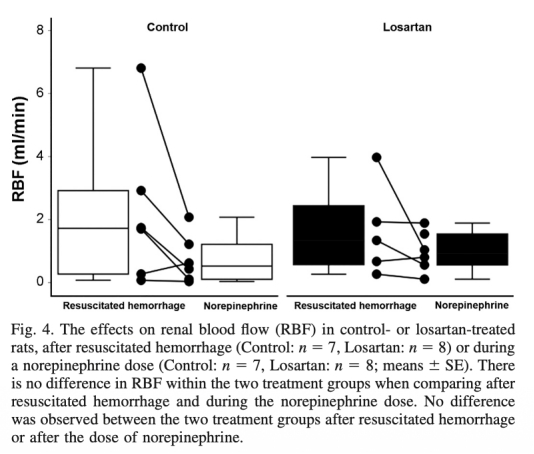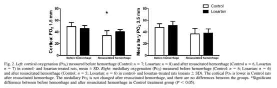 論文得出結論,氯沙坦不降低復蘇后出血后大鼠的腎氧合(皮質和髓質),且不削弱去甲腎上腺素的升壓效率。這表明腎素-血管緊張素系統阻滯劑可能無需在手術前停用,血壓管理在氯沙坦治療下仍有效。