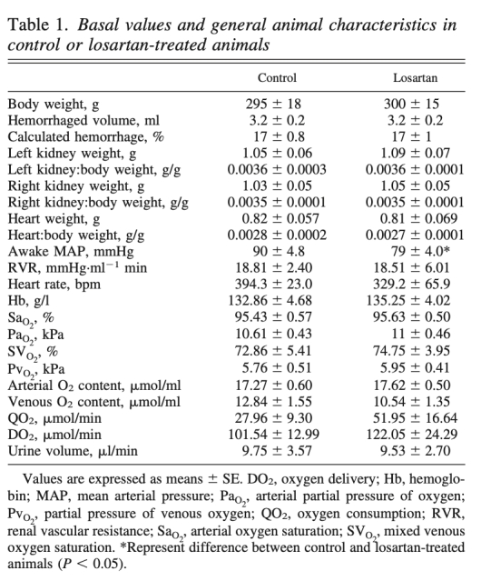 這篇論文的摘要指出,腎素-血管緊張素系統阻滯劑被認為會增加手術和出血后急性腎損傷的風險。先前研究發現氯沙坦不會因降低腎血管阻力而導致大鼠出血后腎皮質缺氧,但未評估復蘇情況。本研究旨在在復蘇后出血模型中研究氯沙坦對腎皮質和髓質氧合的影響,以及去甲腎上腺素的升壓效應。結果顯示,氯沙坦降低平均動脈壓但不影響腎血流量,且不影響腎氧消耗和氧張力。復蘇后出血降低平均動脈壓和腎血流量,但氯沙坦組腎血管阻力增加較小,導致皮質氧張力下降較小,髓質氧張力無顯著變化。去甲腎上腺素對平均動脈壓和腎血流量的效應在氯沙坦組和對照組相似。結論是氯沙坦不降低復蘇后出血后的腎氧合,且不影響去甲腎上腺素的效率。