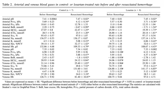 4. 血液氣體參數(如pH、PCO2、PO2等):數據來自表1和表2。研究意義是提供基礎生理狀態,確認出血和復蘇引起的代謝變化(如酸中毒),但氯沙坦無額外影響,增強結果可靠性。