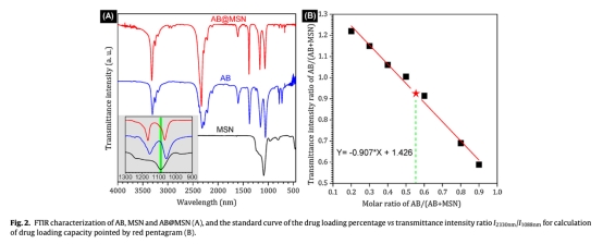 2. 從圖2的FTIR數據顯示AB成功負載到MSN中,負載能力為653 mg/g AB(相當于130.6 mg/g H2),研究意義是證明AB@MSN具有超高H2負載能力,遠超傳統方法,確保高效療法。