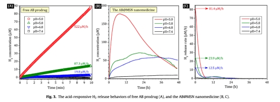 3. 從圖3的H2釋放曲線顯示在酸性PBS(pH=5.0, 5.8, 6.8)中H2釋放速率高,而在pH=7.4幾乎不釋放,研究意義是驗證AB@MSN的酸響應性,能針對腫瘤酸性微環境釋放H2,減少對正常組織影響。
