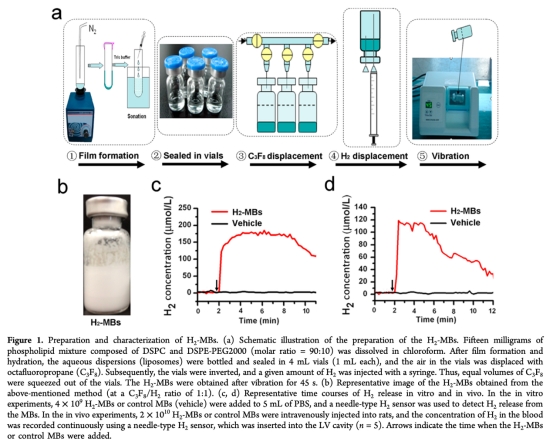 論文摘要指出,心肌缺血-再灌注損傷是導(dǎo)致全球發(fā)病和死亡的主要原因。氫氣(H2)作為一種抗氧化劑,在預(yù)防和治療缺血-再灌注損傷方面具有巨大潛力,但由于其在水中的溶解度低、擴(kuò)散性高,生物利用度差。作者開(kāi)發(fā)了一種超聲波可見(jiàn)的氫氣遞送系統(tǒng),通過(guò)將氫氣加載到微泡(H2-MBs)中,顯著提高了單位體積的氫氣濃度(130.6 mg/g),并實(shí)現(xiàn)了圖像引導(dǎo)的遞送和釋放。在體內(nèi)實(shí)驗(yàn)中,H2-MBs能減少梗死面積、抑制心肌細(xì)胞凋亡、降低炎癥和氧化損傷,表現(xiàn)出高生物安全性。