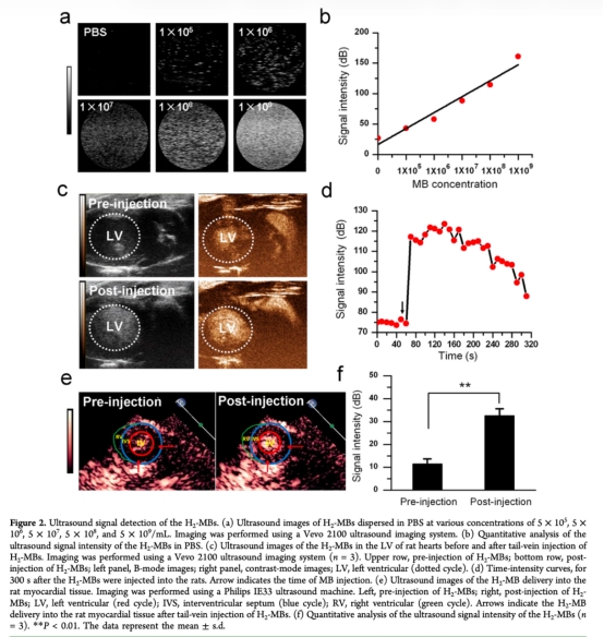 3. 超聲波成像:數(shù)據(jù)來(lái)自圖2a-f。研究意義是H2-MBs作為超聲波對(duì)比劑,信號(hào)強(qiáng)度與濃度相關(guān),能在心臟和心肌組織中可視化跟蹤,實(shí)現(xiàn)圖像引導(dǎo)的遞送和劑量監(jiān)控。