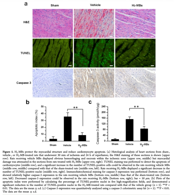 6. 組織學(xué)分析:數(shù)據(jù)來(lái)自圖5a-c。研究意義是H&E染色、TUNEL assay和caspase-3表達(dá)顯示H2-MBs減少心肌壞死、凋亡和caspase-3活性,證實(shí)細(xì)胞保護(hù)作用。