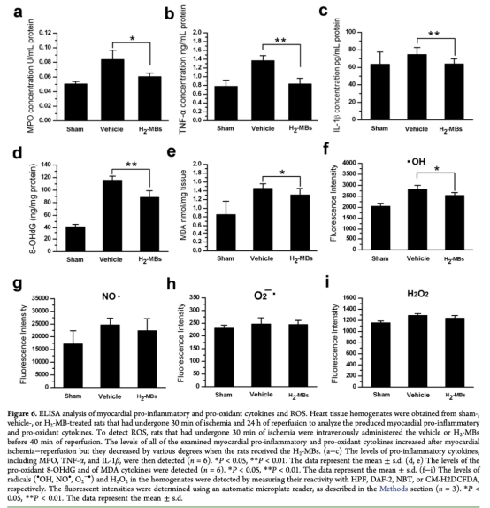 7. 炎癥和氧化應(yīng)激指標(biāo):數(shù)據(jù)來(lái)自圖6a-i。研究意義是ELISA和ROS檢測(cè)顯示H2-MBs降低MPO、TNF-α、IL-1β、8-OHdG、MDA水平,并選擇性減少羥基自由基(*OH),而不影響其他ROS,表明其通過(guò)抗氧化和抗炎機(jī)制發(fā)揮作用。