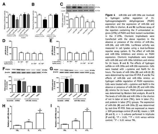 4. miRNAs介導的數(shù)據(jù):來自圖4A-I,熒光素酶實驗顯示miR-26b和miR-199a直接靶向PGDH 3'-UTR;氫硫化物抑制這些miRNA表達,且其 mimics 逆轉(zhuǎn)氫硫化物對PGDH的上調(diào)作用;臨床樣本中TL和PTL組miR-26b和miR-199a表達上調(diào)。研究意義:揭示了氫硫化物通過調(diào)控miRNAs來調(diào)節(jié)PGDH的表觀遺傳機制,豐富了分娩的分子網(wǎng)絡(luò)理解。
