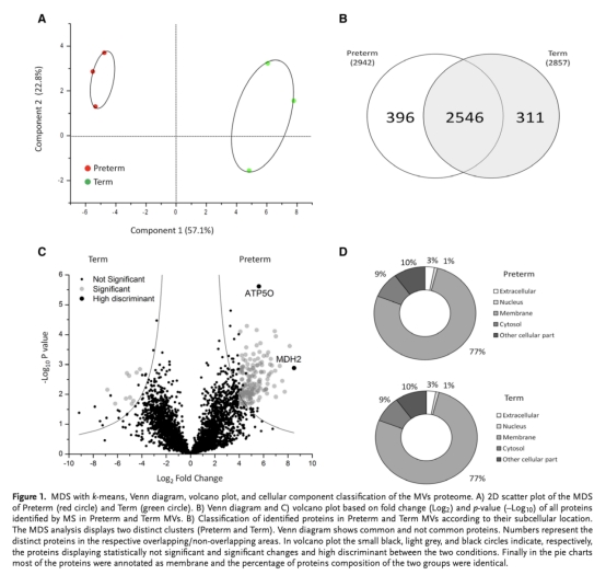 論文摘要指出,微泡是細胞膜出芽形成的200-1000納米體,是生物標志物的有希望來源。本研究比較了通過超速離心從早產(<34周)和足月(≥37周)嬰兒臍帶間充質干細胞培養中收集的微泡蛋白質組,旨在建立早產的特征簽名。使用Orbitrap質譜、統計、生物信息學和生化分析,結果顯示共識別了3253個蛋白質,早產和足月微泡有78.3%匹配,但主成分分析顯示它們的蛋白質組聚類分離。Cytoscape分析表明早產微泡的基因簽名圍繞炎癥和氧化代謝。早產和足月微泡都消耗氧氣并表達ATP合酶和細胞色素氧化酶,但只有早產微泡合成ATP。研究臨床意義在于微泡可作為早產嬰兒炎癥和代謝狀態的傳感器,幫助預防并發癥。