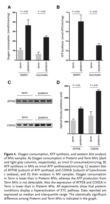3. ATP合成數據:來自圖4B和C,ATP合成測定顯示只有早產微泡能合成ATP(早產組:約800 nmol ATP/min/mg,足月組:幾乎無合成),Western blot證實ATP合酶和細胞色素氧化酶在早產微泡中表達更高。研究意義:這證明早產微泡的氧消耗與ATP合成耦合,反映了其代謝效率,表明微泡可作為早產代謝狀態的實時傳感器,為預防并發癥提供干預靶點。