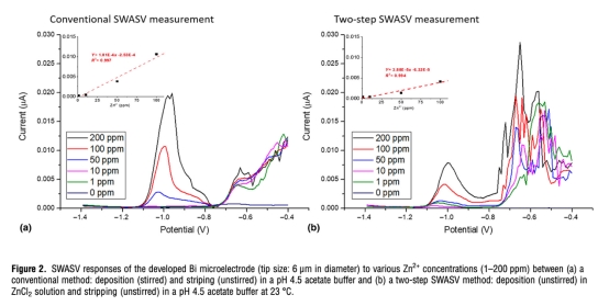 1 研究成功構建了一種新型的兩步SWASV方法,并證明了其用于植物體系中Zn2+檢測的可行性。