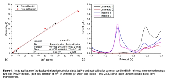 4 原位檢測數據:使用雙管Bi/Pt微電極在經Zn2+處理和處理(浸于1 mM ZnCl2 6小時)的柑橘葉片中脈測量SWASV響應,并換算成Zn2+濃度,來自圖4(b)。研究意義是直接證明了該傳感器能成功區分處理與未處理的植物樣本,并定量檢測出植物組織內的Zn2+,實現了研究的最初目標。