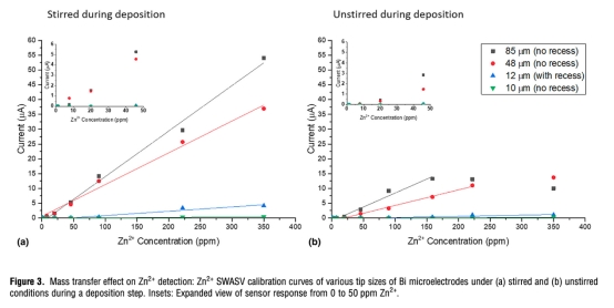 本研究介紹了一種新型的基于兩步方波陽極溶出伏安法的針型微傳感器,用于柑橘植物中Zn2+的原位檢測。研究成功制備了一種雙管鉍/鉑微電極,其堅固的金屬尖端足以刺穿柑橘葉片的厚表皮,并利用SWASV技術靈敏地檢測Zn2+濃度的ppb級變化。該微電極旨在減少傳質限制并改善檢測限??傮w而言,所開發的Bi/Pt微電極成功測量了柑橘植物維管束內的Zn2+濃度。