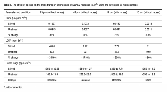 3 尖端尺寸與傳質效應數據:測量了不同尖端尺寸(如10, 12, 48, 85 μm)的微電極在攪拌與未攪拌條件下的靈敏度、檢測限和線性范圍,來自圖3和表I。研究意義是優化了電極設計,證明較小的尖端尺寸能減輕未攪拌條件下的傳質限制,這對于在無法攪拌的植物體內進行原位測量至關重要。