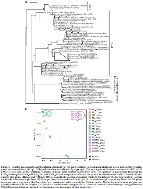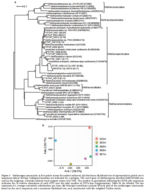 本論文摘要指出,海洋缺氧區(OMZs)蘊藏著海洋中最大的甲烷庫,但其來源和歸宿卻知之甚少。本研究針對全球最大的OMZ——東熱帶北太平洋(ETNP)展開。高分辨率水體剖面顯示,在ETNP缺氧核心區存在一個300米厚的甲烷高值層(20-105 nM)。沉積物培養實驗確定,當OMZ與大陸架在350至650米水深處相交時,海底是一個清晰的甲烷來源,其通量反映了上覆缺氧水體中的甲烷濃度。進一步的培養實驗表明,在孔隙水中同時存在硫酸鹽和硝酸鹽的情況下,沉積物表層具有高達88 nmol g?1 day?1的產甲烷潛力。在這些產甲烷沉積物中,大多數(85%)的甲基輔酶M還原酶α亞基(mcrA)基因序列與甲烷八疊球菌科(Methanosarcinaceae)聚為一支,該科能夠進行非競爭性產甲烷作用。使用13C-CH?進行的培養實驗表明,在OMZ內部及上方的水體中均存在好氧和厭氧甲烷氧化的潛力。好氧和厭氧甲烷氧化分別通過顆粒性甲烷單加氧酶(pmoA)基因序列的存在得到證實,這些序列分別與已知可進行亞硝酸鹽依賴的厭氧甲烷氧化(N-DAMO)的I型甲烷氧化菌和“Candidatus Methylomirabilis oxyfera”譜系相關。