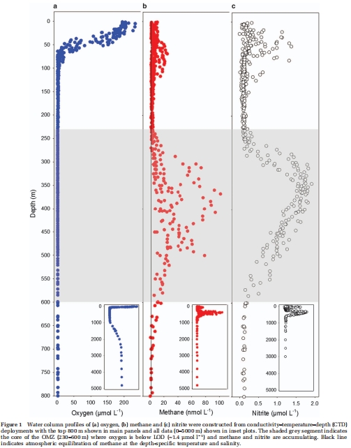 甲烷的遷移與積累:底棲產(chǎn)生的甲烷進入水體,在OMZ的缺氧核心區(qū)(230-600米)積累形成甲烷富集層,并可以持續(xù)到離岸數(shù)百公里處。