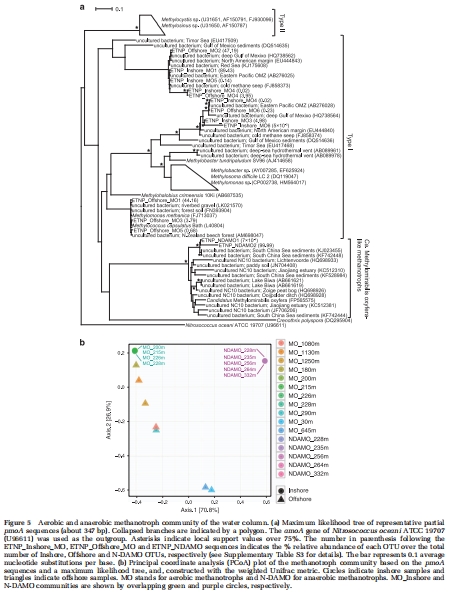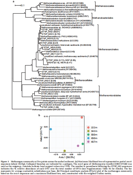 研究意義:圖3a的系統(tǒng)發(fā)育樹顯示產(chǎn)甲烷菌群落以甲烷八疊球菌科(Methanosarcinaceae)為主,這類菌可利用甲基化合物進行非競爭性產(chǎn)甲烷,從微生物角度解釋了為何在硫酸鹽存在下仍能產(chǎn)甲烷。圖5a顯示好氧甲烷氧化菌主要為I型,且檢測到與N-DAMO相關的序列,從分子水平證實了水體中存在好氧和厭氧甲烷氧化的潛力。主坐標分析(PCoA)(圖3b, 5b)展示了群落結構的差異。