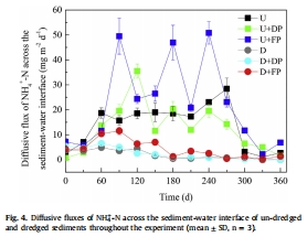 研究意義:圖3顯示疏浚后初期孔隙水銨態氮濃度較高,但隨后迅速下降并顯著低于未疏浚沉積物。圖4清晰地表明,疏浚沉積物的銨態氮釋放通量在整個實驗期間(尤其是60天后)持續顯著低于未疏浚沉積物,且不受懸浮顆粒物添加的顯著影響。這直接證明了疏浚在抑制內源氮釋放方面的有效性,并與磷的行為(懸浮顆粒物會顯著增加磷通量)形成鮮明對比。