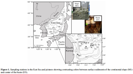 站點(diǎn)選擇與對(duì)比:在蔚陵盆地選擇了兩個(gè)具有對(duì)比性的站點(diǎn):陸坡站點(diǎn)M1(水深1453米,沉積物呈灰褐色)和盆地中心站點(diǎn)D3(水深2154米,沉積物因富含錳氧化物呈紅褐色)。圖1清晰地展示了站點(diǎn)位置和沉積物外觀的顯著差異。