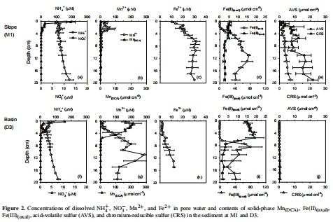 測量指標(biāo):孔隙水中的NH??, NO??, Mn2?, Fe2?濃度;固體相中的Mn(DCA), Fe(草酸鹽), AVS, CRS含量。