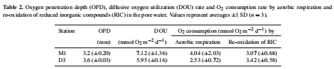 精確界定氧化還原邊界:Unisense微電極能夠以高空間分辨率(毫米級(jí))測量沉積物中的氧氣濃度剖面(圖3)。這使研究人員能夠精確確定氧氣滲透深度(OPD),即溶解氧降至檢測限以下的深度。在本研究中,兩個(gè)站點(diǎn)的OPD均非常淺(<4毫米),這一定量數(shù)據(jù)是判斷表層沉積物氧化狀態(tài)和有氧呼吸活動(dòng)深度范圍的首要依據(jù)。