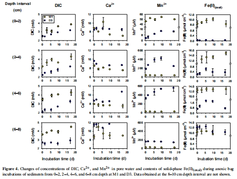 研究意義:圖4顯示,站點(diǎn)D3的沉積物在培養(yǎng)期間有大量的Mn2?釋放,尤其是在2-4厘米深處,直接證明了強(qiáng)烈的微生物錳還原活性。而站點(diǎn)M1的Mn2?釋放可忽略不計(jì),但Fe(II)有顯著積累。這些直接測得的速率是計(jì)算錳、鐵還原對(duì)Corg氧化貢獻(xiàn)的關(guān)鍵。