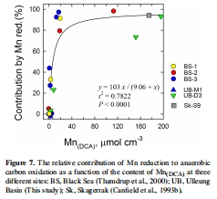 普遍性意義:錳還原對(duì)Corg氧化的相對(duì)重要性與錳氧化物含量呈飽和動(dòng)力學(xué)關(guān)系,且半飽和值很低(圖7)。這表明,即使在錳氧化物含量中等(>8-10 μmol cm?3)的許多大陸邊緣和深海沉積物中,錳還原也可能是一個(gè)重要但被低估的碳氧化途徑。