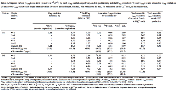 將微電極測得的氧氣消耗速率、厭氧培養(yǎng)測得的DIC產(chǎn)生速率以及放射性示蹤測得的硫酸鹽還原速率相結(jié)合,計(jì)算各途徑對(duì)總Corg氧化的貢獻(xiàn)。